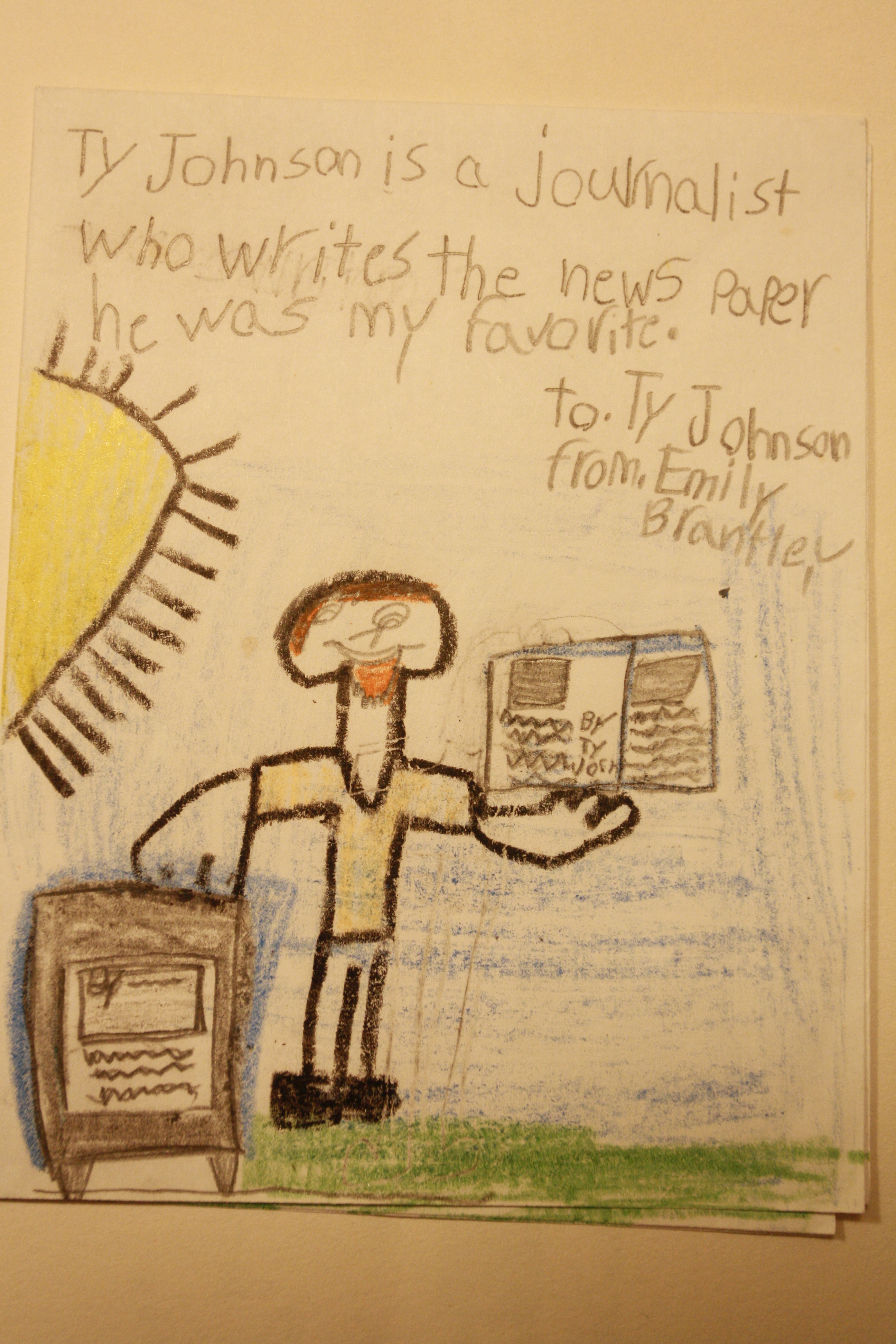 (inside) “Ty Johnson is a journal-ist that came to are school yesterday we leared a lot.” beside a picture of the News Argus with the sun shining down.