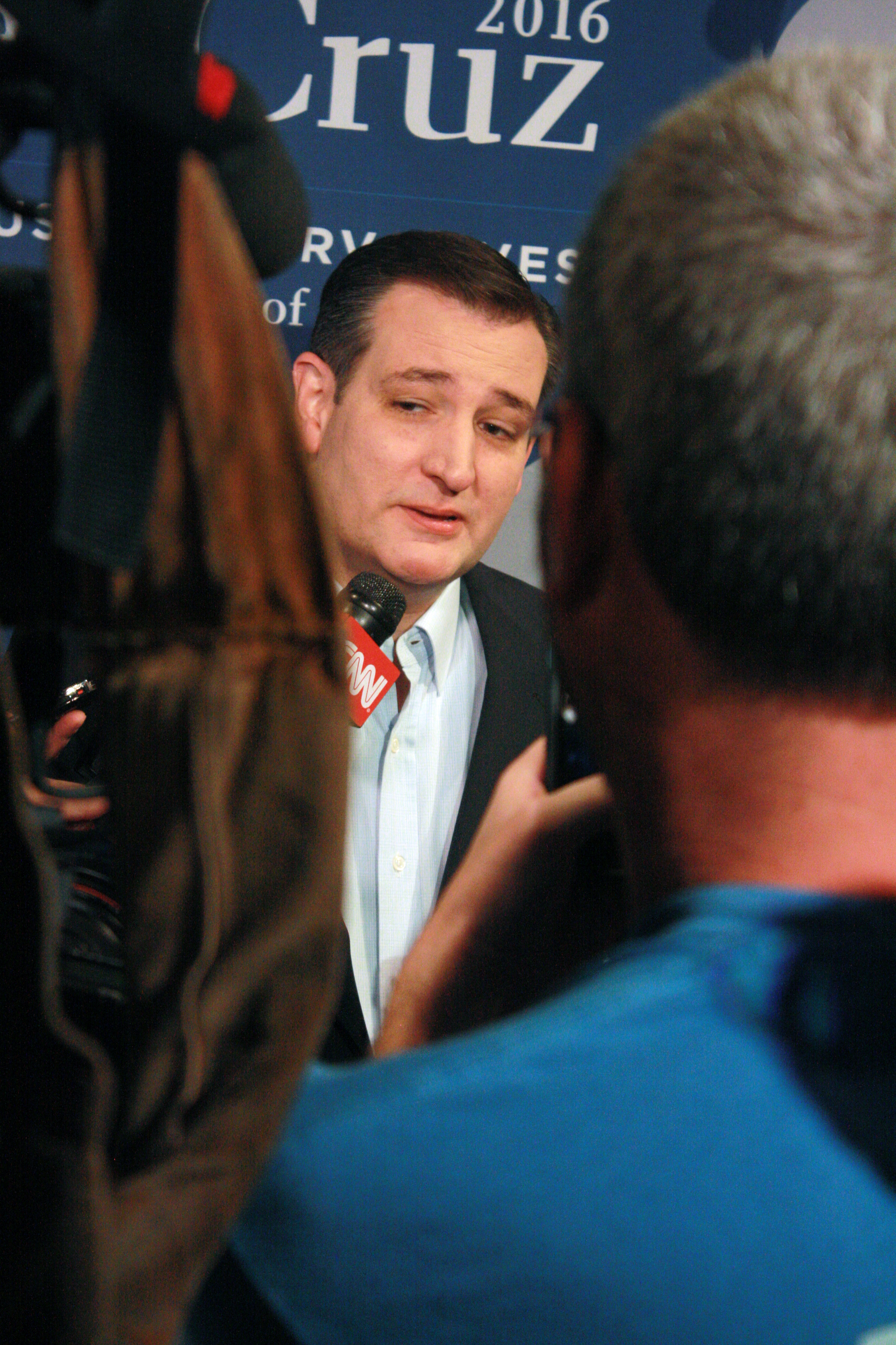 Sen. Ted Cruz (R-TX) talks to reporters ahead of a rally near Raleigh, North Carolina on March 8, 2016.