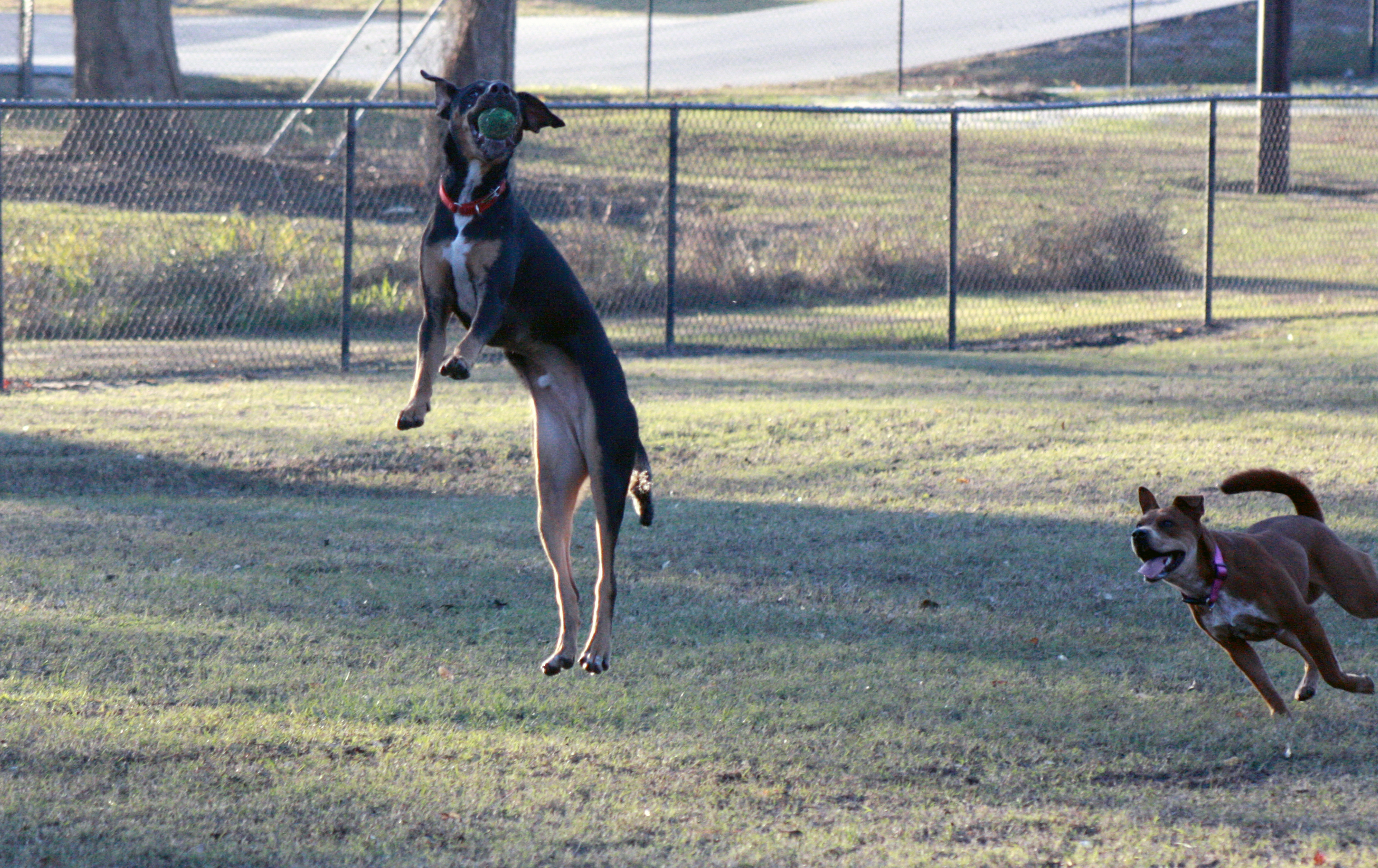 Hashbrown leaps high above Sara to catch a tennis ball at the Rotary Dog Park in Kinston, N.C. on Nov. 21, 2016
