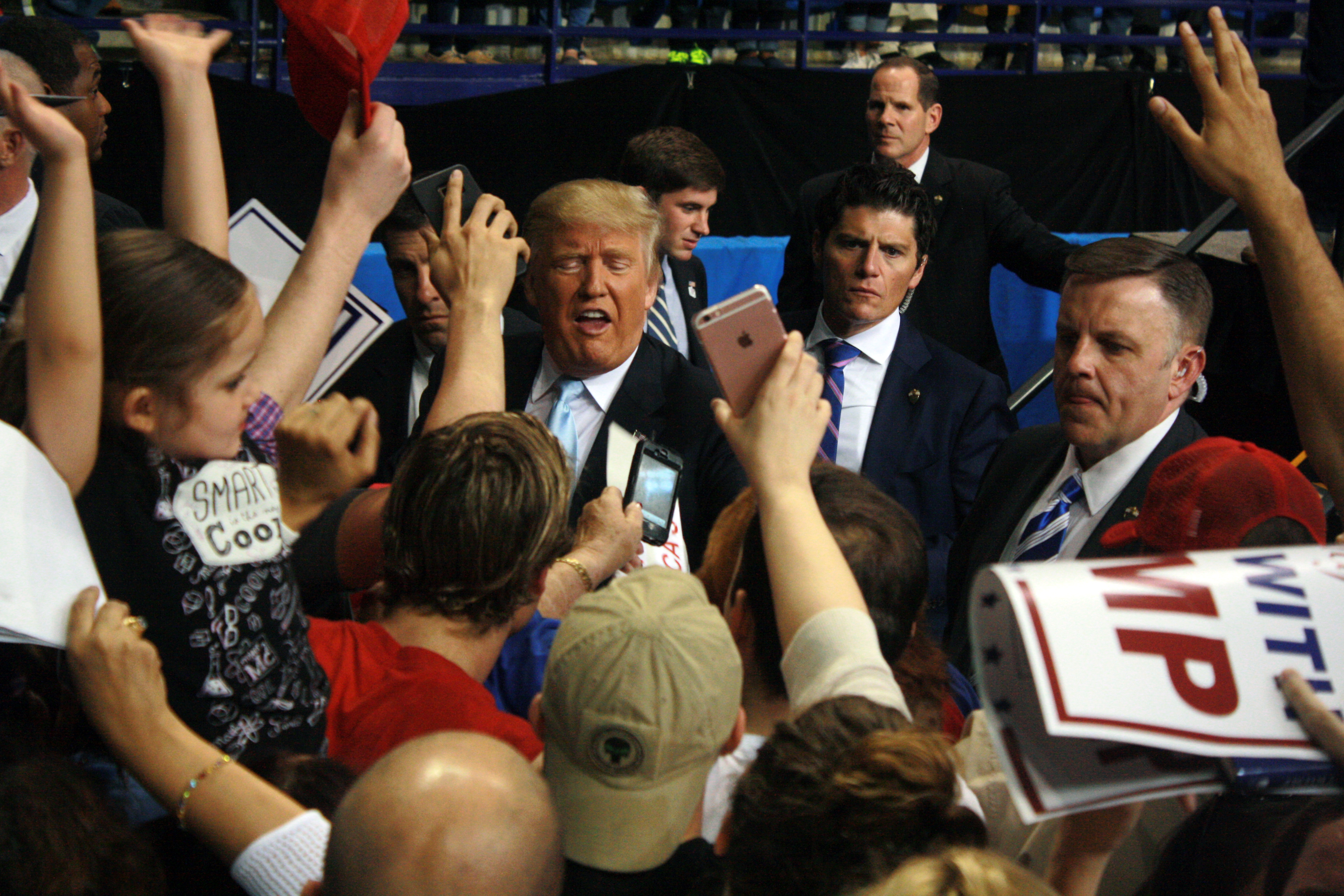 Donald Trump reacts to a crowd of supporters seeking autographs after a campaign rally in Fayetteville, N.C. on March 9, 2016.